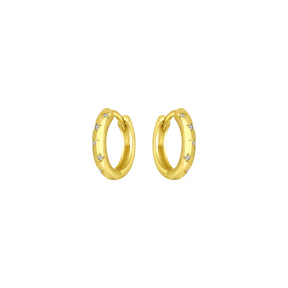 18k gold plated 925 sterling silver, cubic zirconia, 11mm length, 7mm inner diameter. Hypoallergenic.