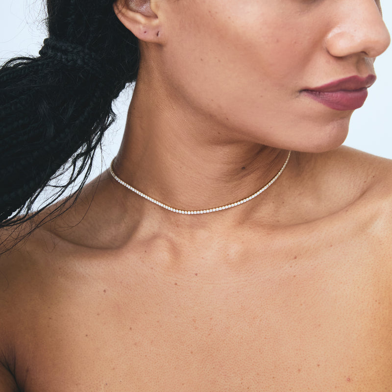 The stunning Diana choker features a sparkling array of 1.75mm cubic zirconia stones to add a luxe touch to any outfit. Style it alone or stacked with our chain necklaces.