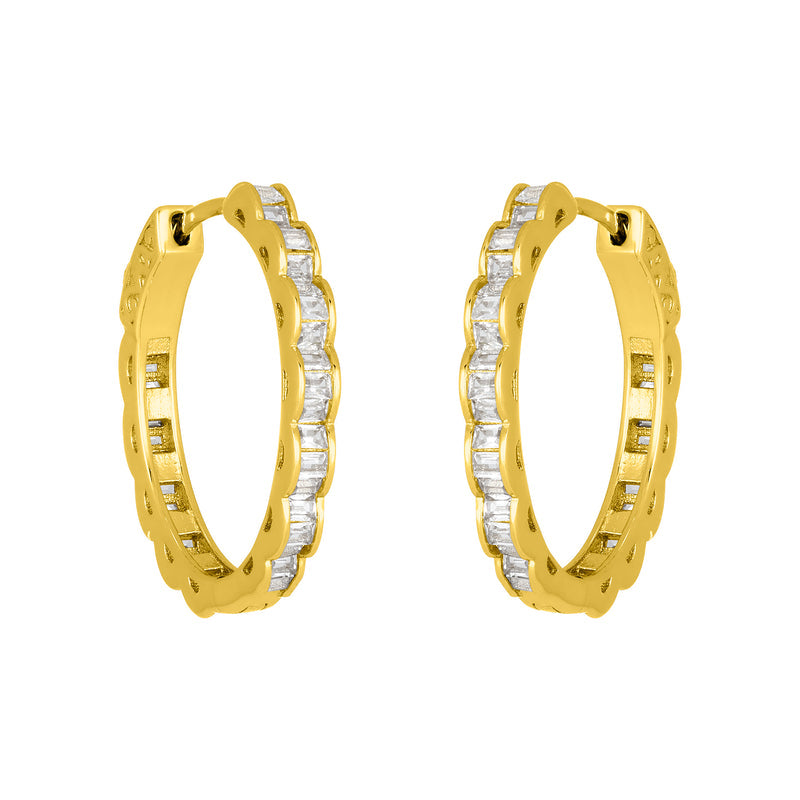 18k gold plated 925 sterling silver, cubic zirconia, 25mm diameter. Hypoallergenic.