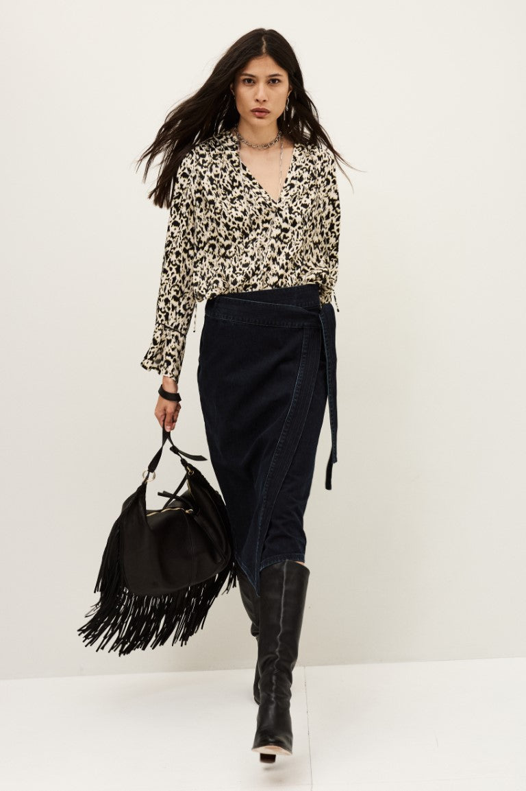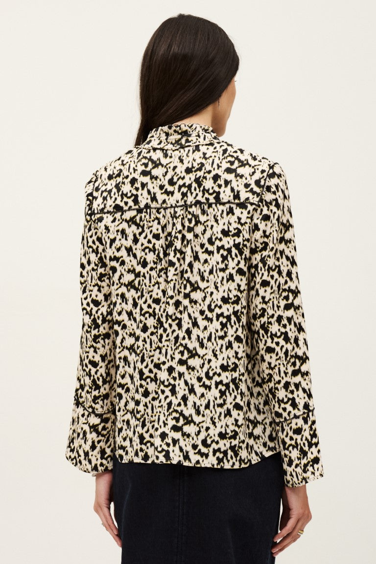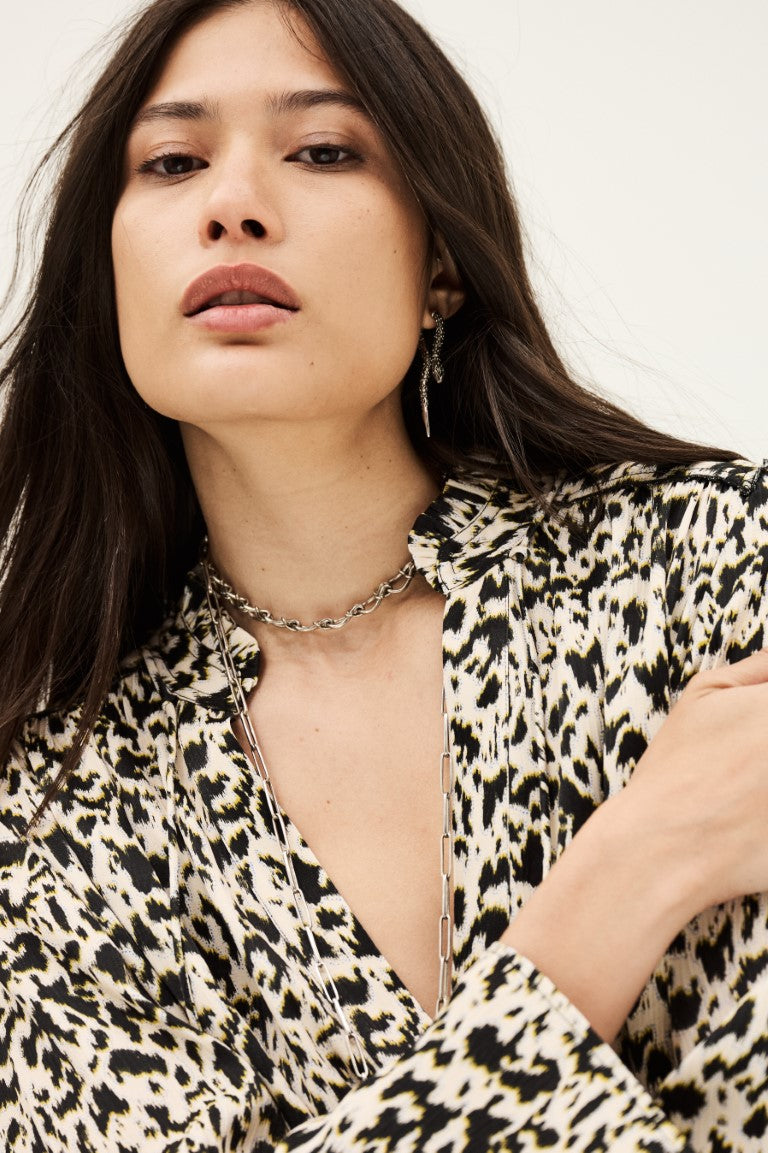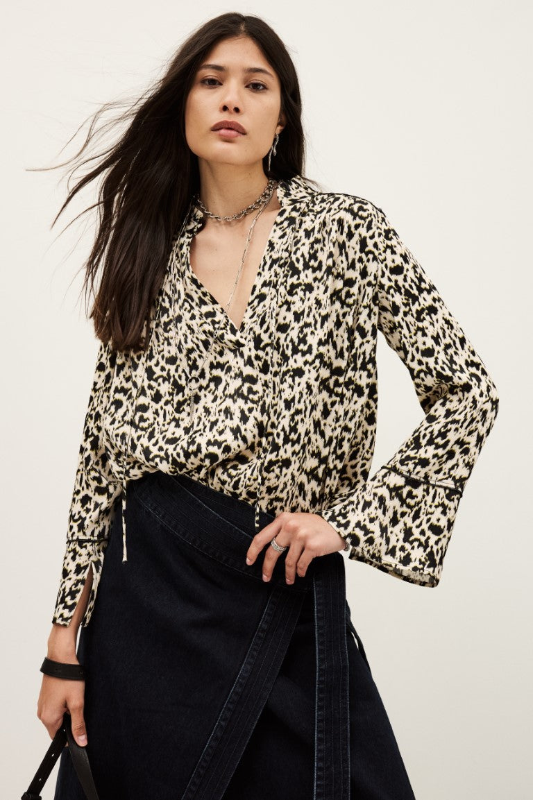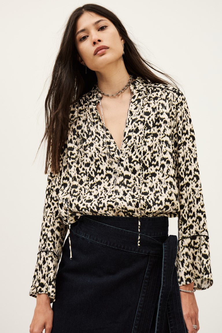 - Patterned flared blouse, long sleeves, flared at the bottom