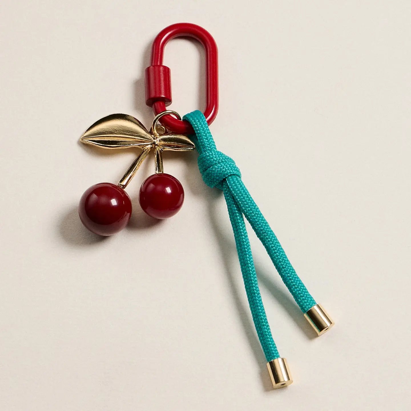 Add a pop of fun to your accessories with this enamel cherry charm keychain. Featuring a glossy red cherry with gold-tone leaves, paired with a vibrant teal rope and red clasp, this keychain brings playful charm to your keys, bags, or purses. Lightweight and colorful, it’s the perfect everyday accessory.