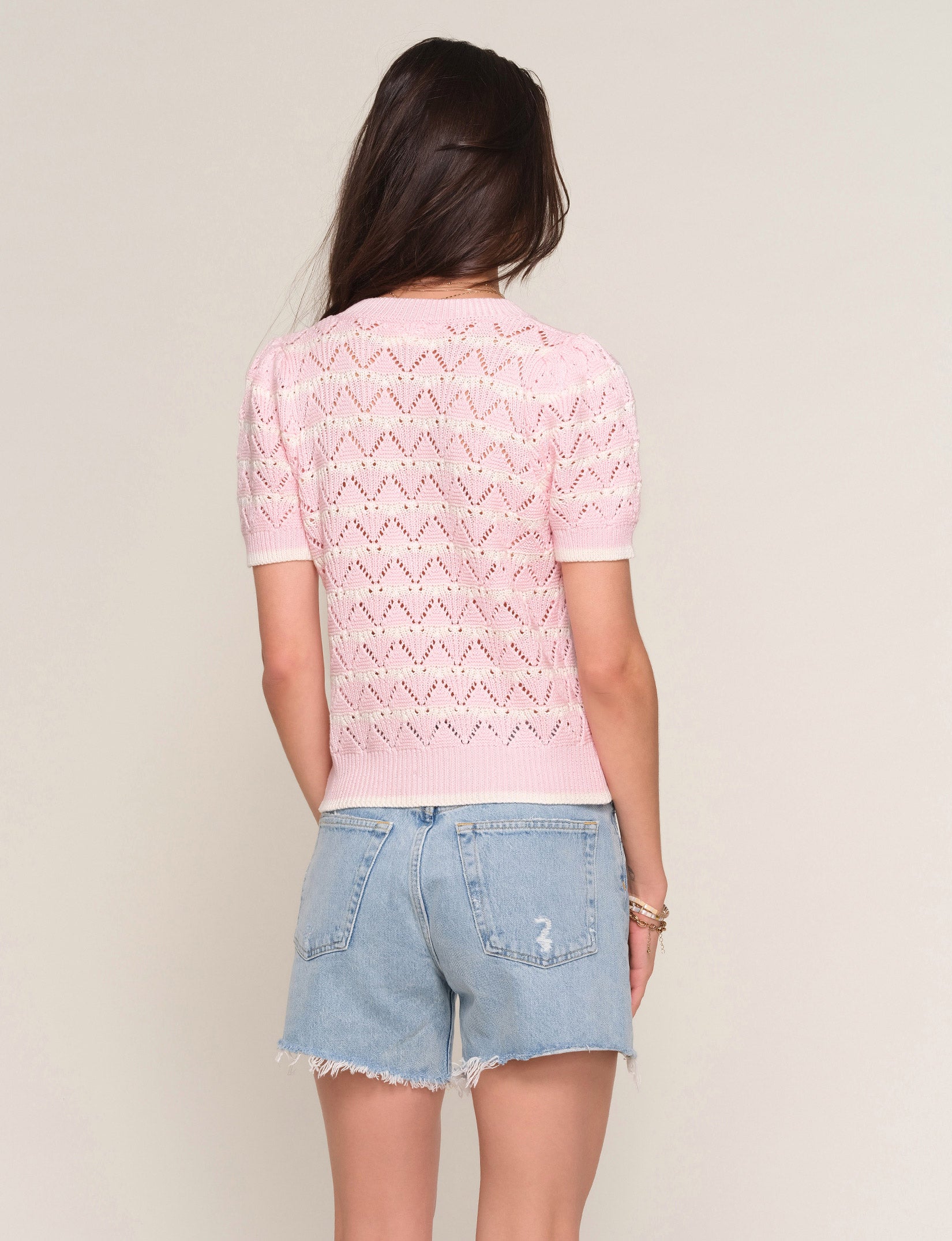 A charming knit top with a romantic, vintage-inspired feel. Designed with a flattering slim fit, it features delicate openwork detailing throughout and a soft ribbed hem that defines the silhouette. The short sleeves and buttoned neckline add a polished touch, while the subtle striped pattern gives it playful texture. Perfect with high-rise denim or tailored trousers for effortless day-to-night styling.