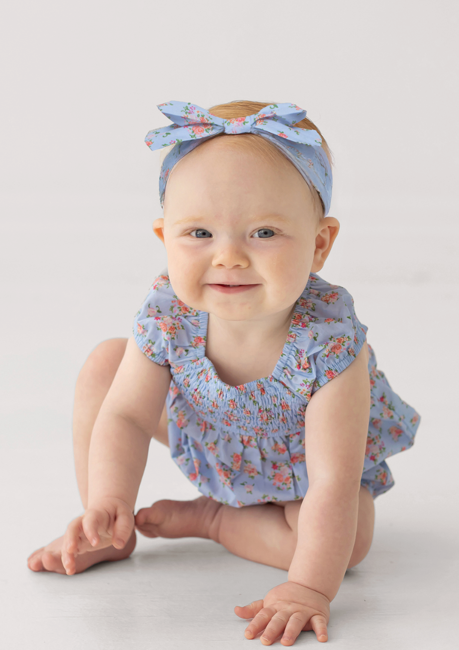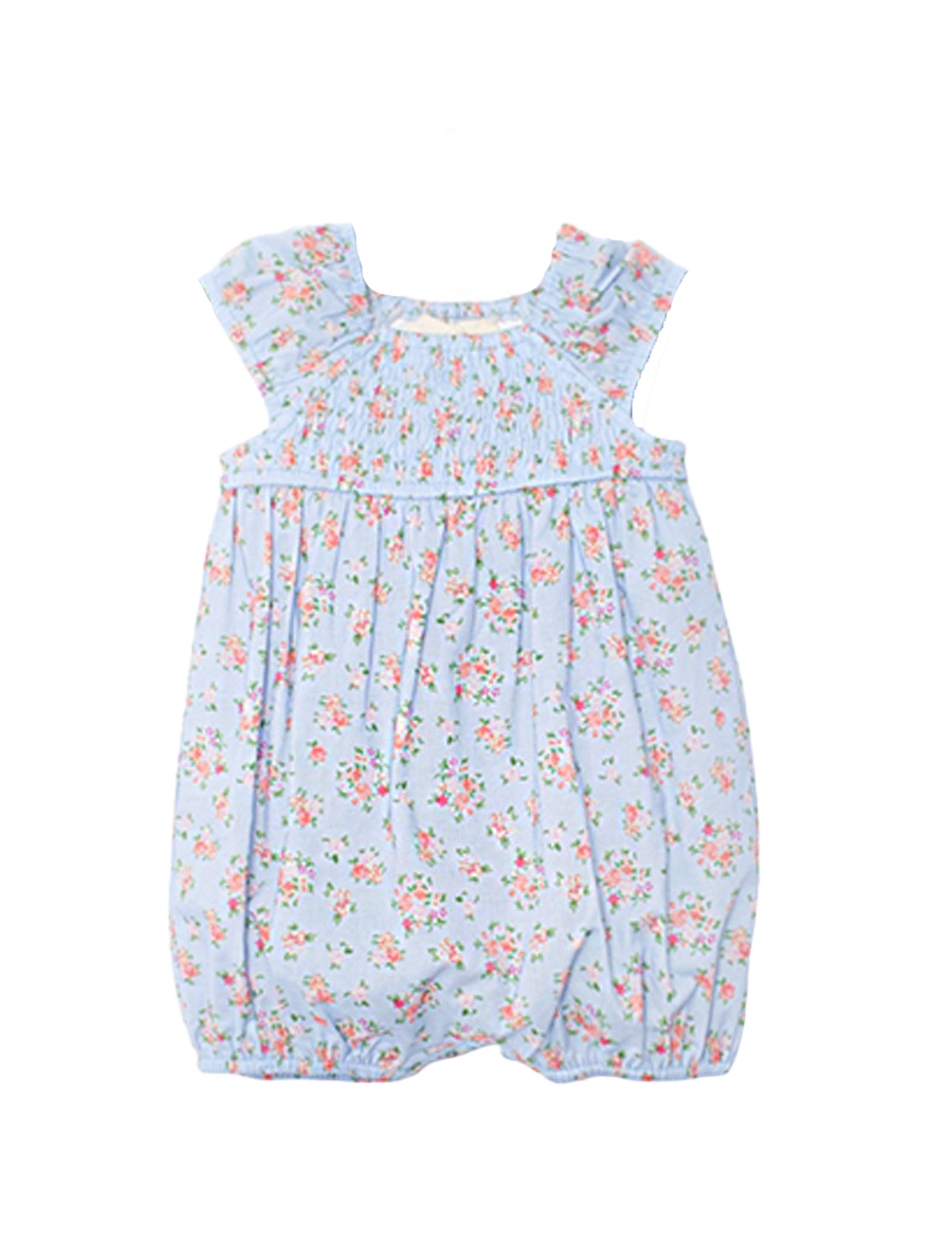 This adorable baby girl's romper features a soft floral fabric with delicate smocking. The soft colors of the floral print give it a charming, vintage feel.
