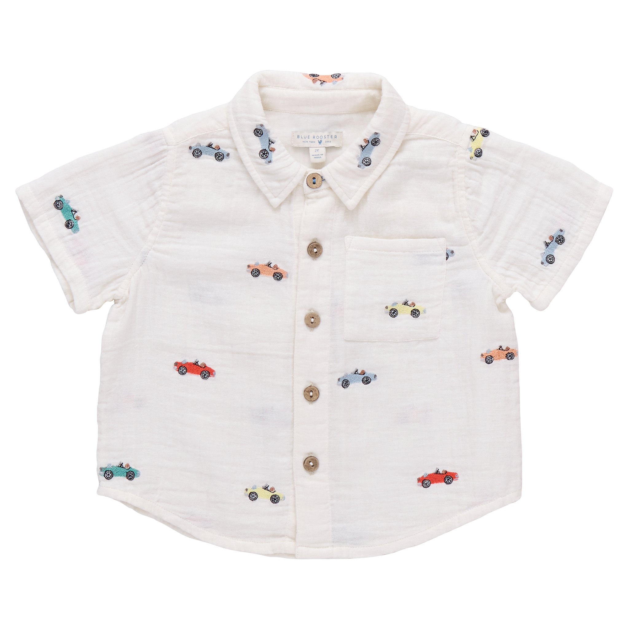 A classic button-down infused with playful personality for spring and beyond! This Jack Shirt features charming vintage car embroidery scattered throughout, adding a whimsical touch to a timeless silhouette. Designed with a crisp collar, short sleeves, and a relaxed fit, it’s polished enough for special occasions yet comfortable enough for everyday wear. An easy favorite that brings a sense of fun and nostalgia to boys’ spring wardrobes.
