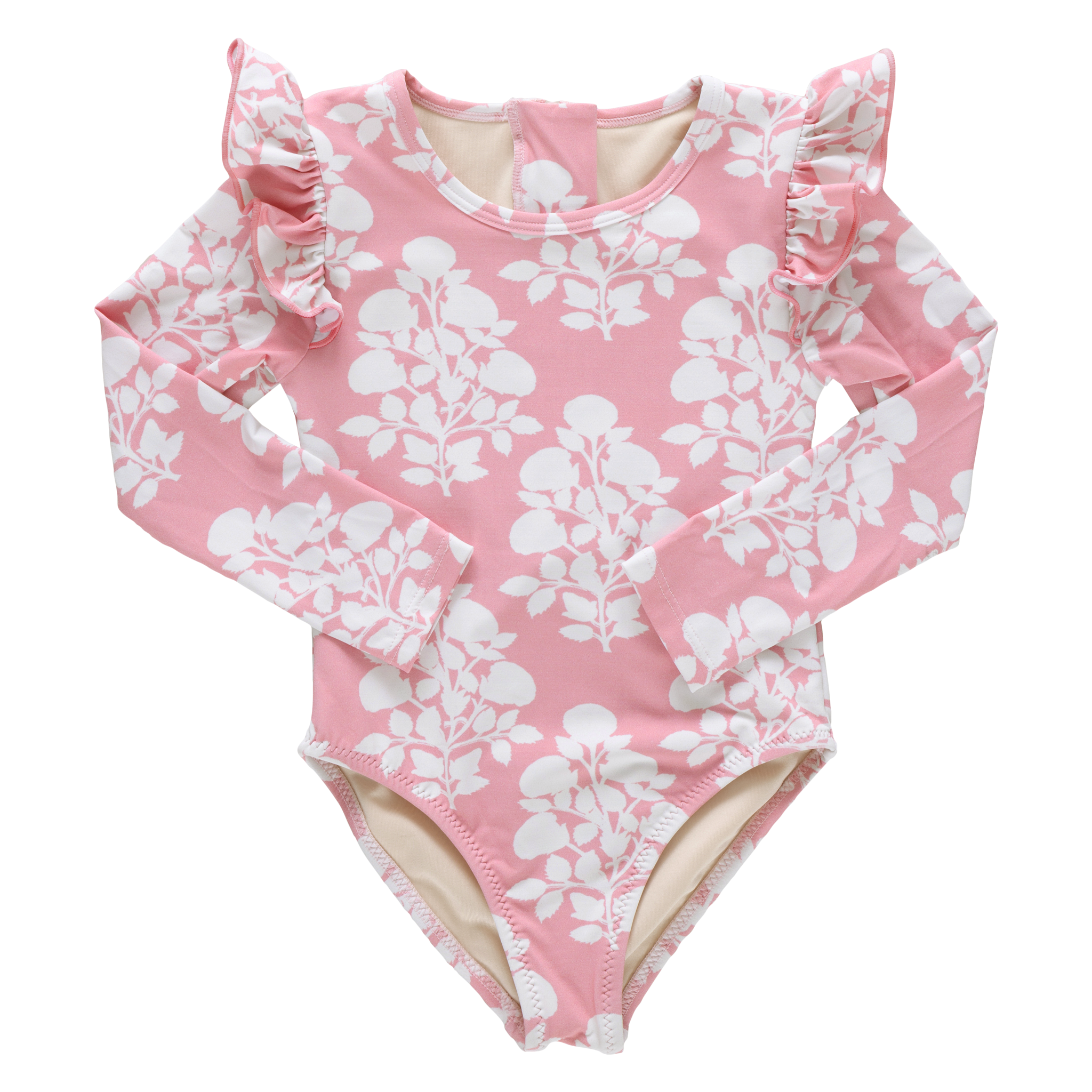 A forever favorite in our Pink Bouquet Floral, this long sleeve one-piece blends vintage charm with thoughtful detail. Ruffle shoulders frame the silhouette beautifully, while soft pink pearl stitching adds a delicate finish. The 3/4 back zipper with a white pull makes it easy to slip on and off after a full day of swimming, splashing, and seaside wandering.
