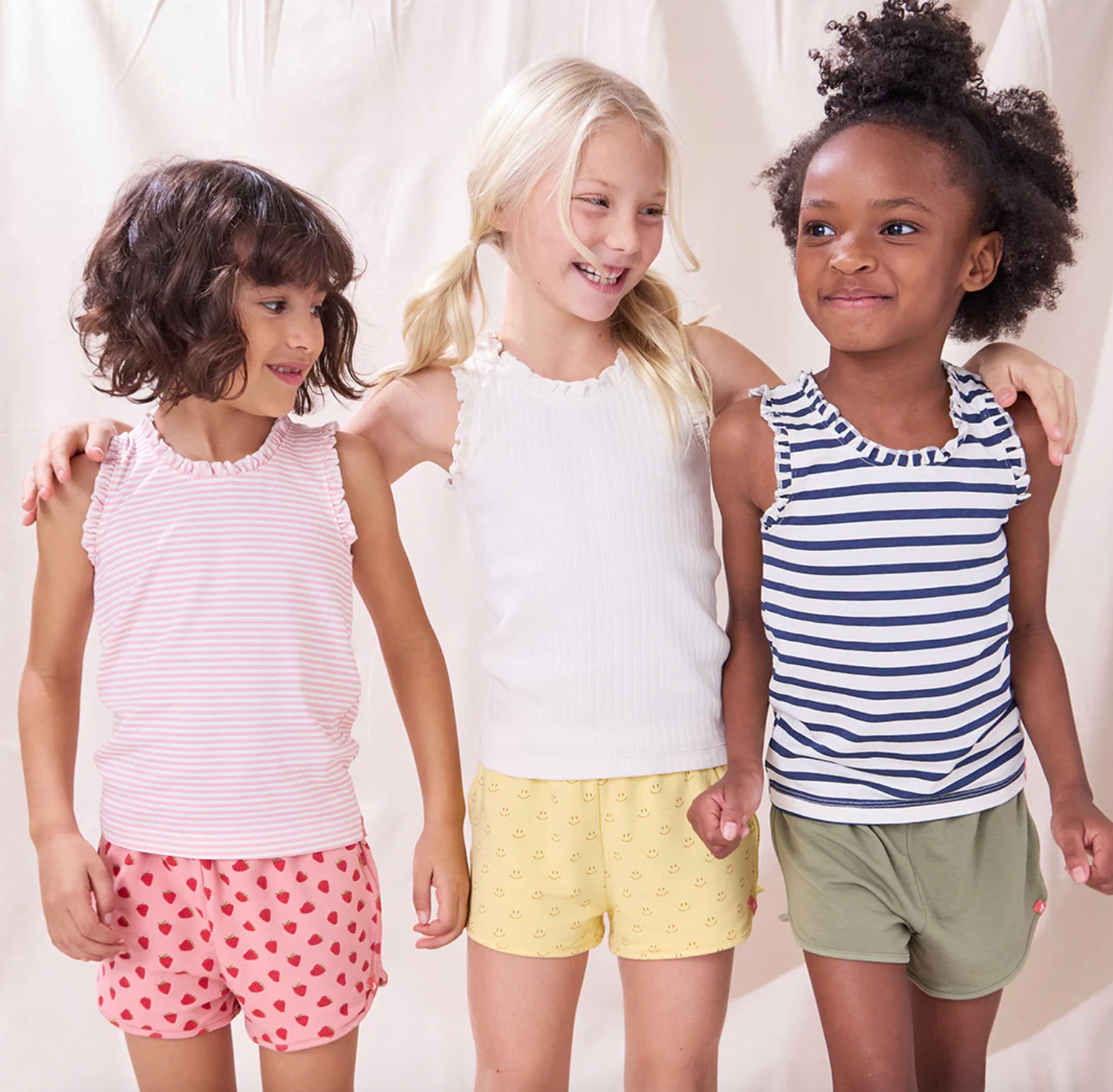 A classic fave with a playful twist! Our Joy Ruffle Tank is back with a fresh new rib pattern in the softest organic cotton. Featuring sweet, fluttery ruffles at the neck and arms, this sleeveless staple is made for sunny days and endless fun. Available in mix-and-match solids that pair perfectly with any of our Coop shorts or leggings!