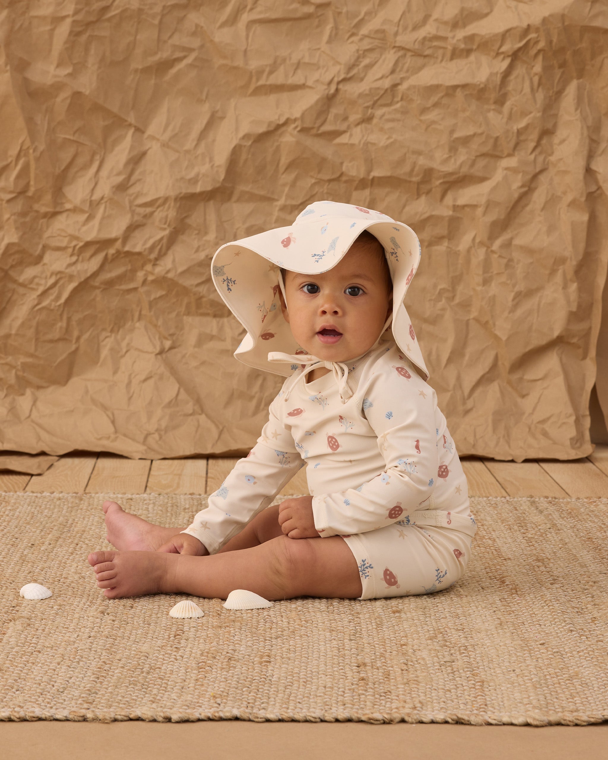 This two-piece rashguard set will have your little one protected from the sun in style. Featuring a long sleeve rashguard top and coordinating swim short bottoms with an adjustable drawstring. Add a pinch of fun to your wardrobe with this cute coastal print.