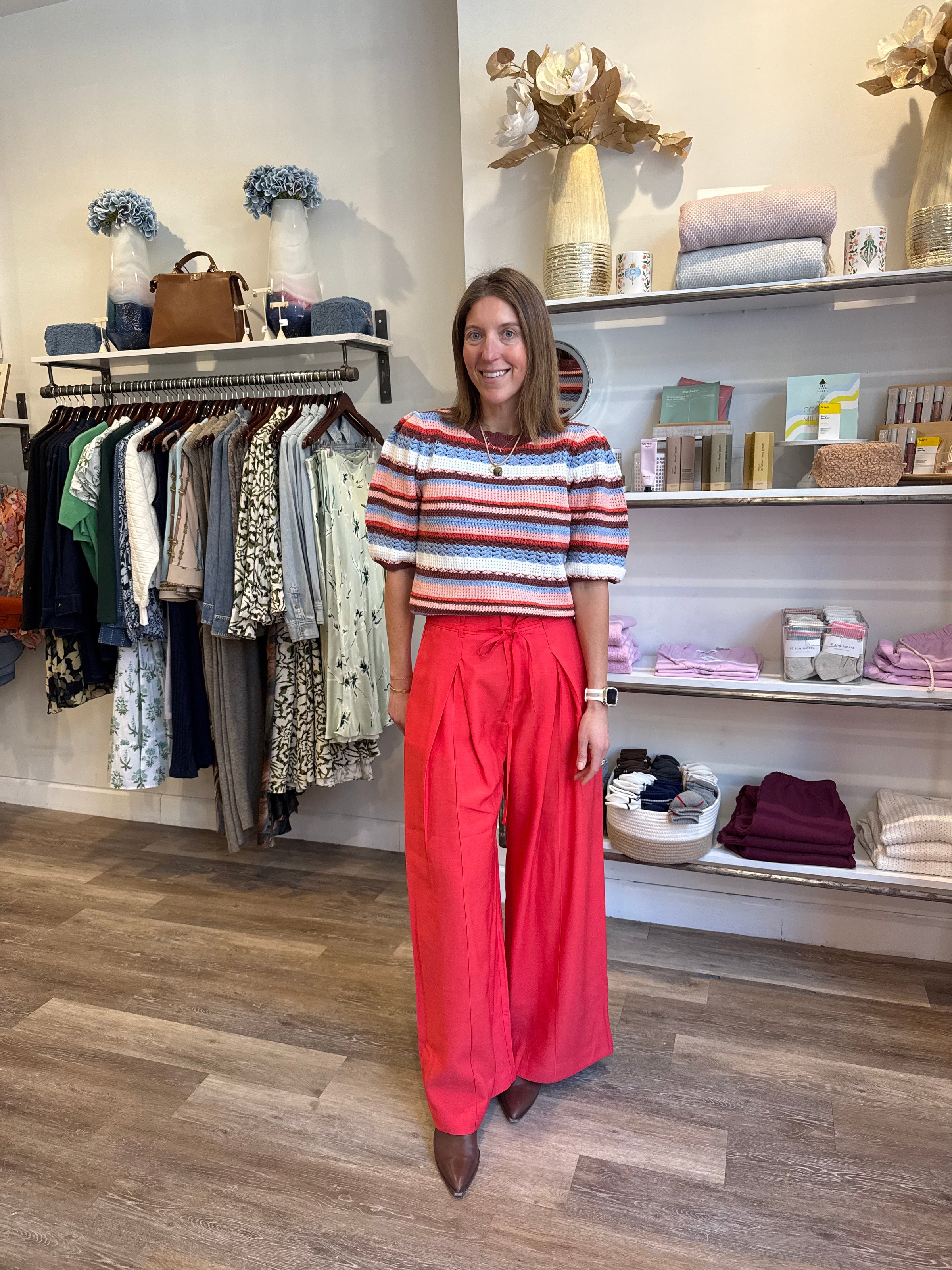 Colorful crochet-style striped short-sleeve sweater top featuring a scalloped neckline, hem, and sleeves.