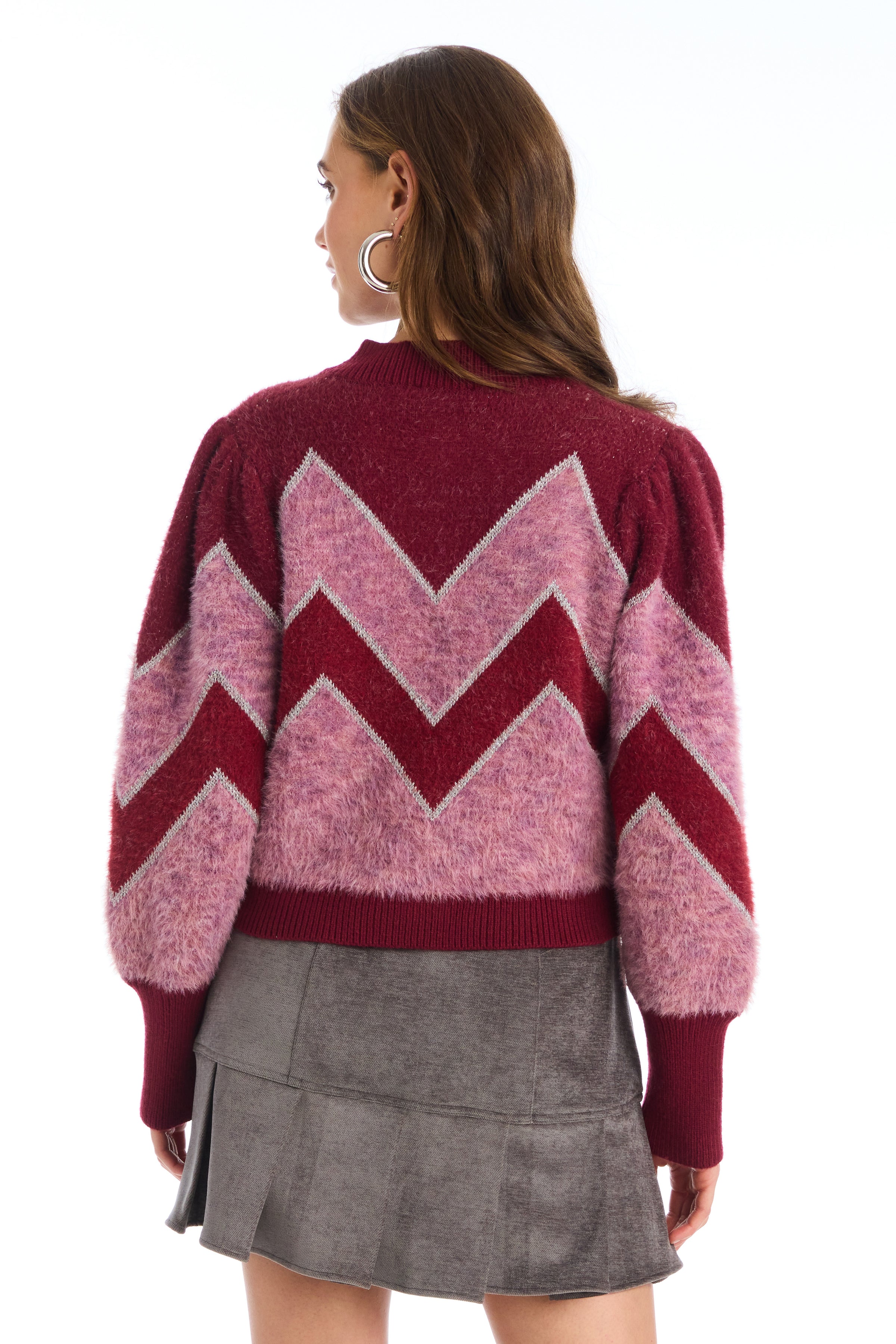 The Fuzzy Chevron Cardigan is a blue-hued cozy dream adorned with oversized crystal buttons. Slightly cropped in length and designed with a billowing sleeve leading into an elongated ribbed cuff. A hint of metallic throughout makes this sweater perfect to dress up.
