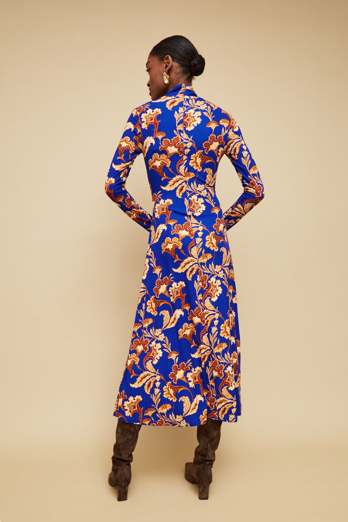 Here is a long sleeve funnel-neck dress with draped waist and voluminous hem