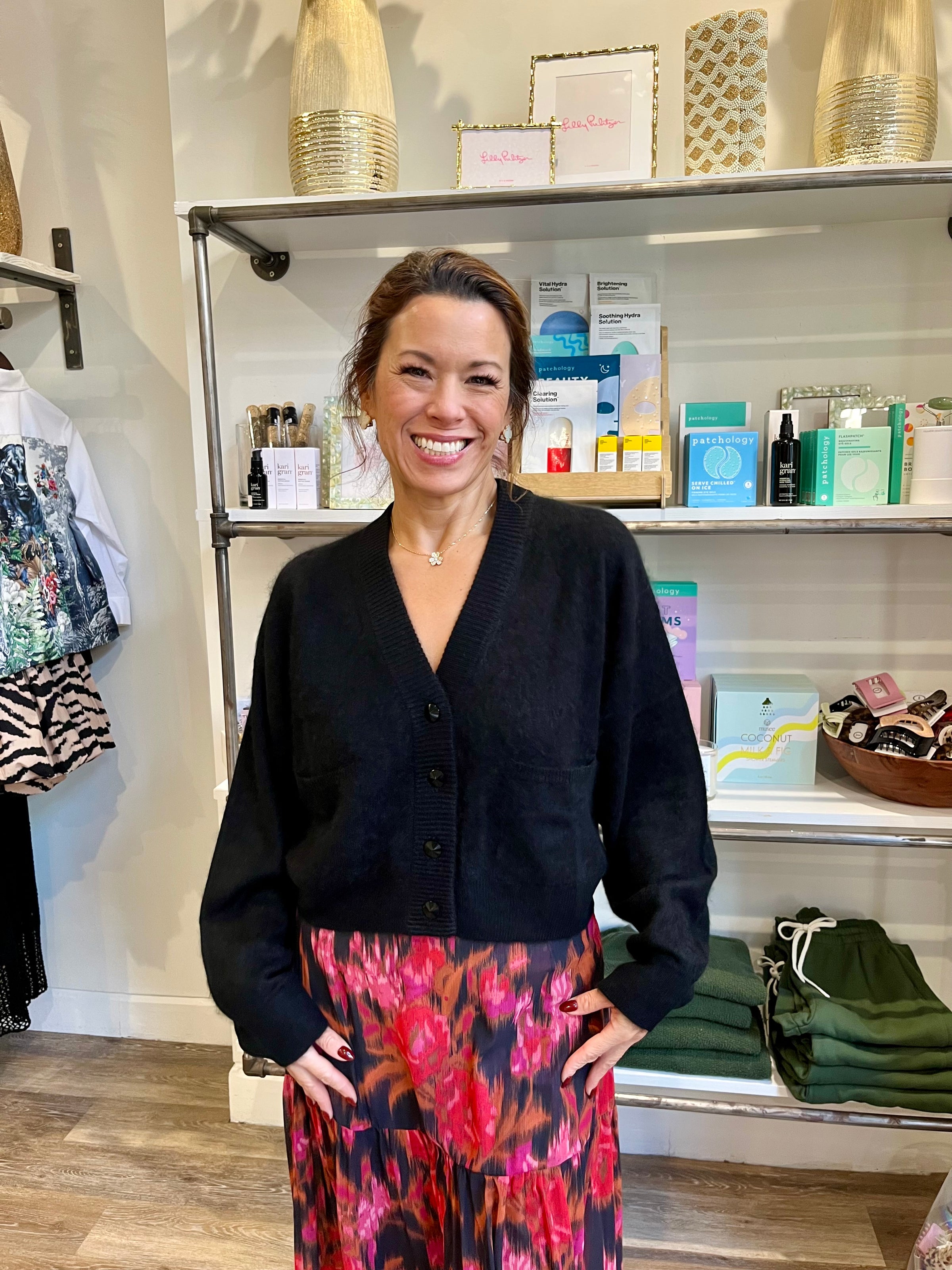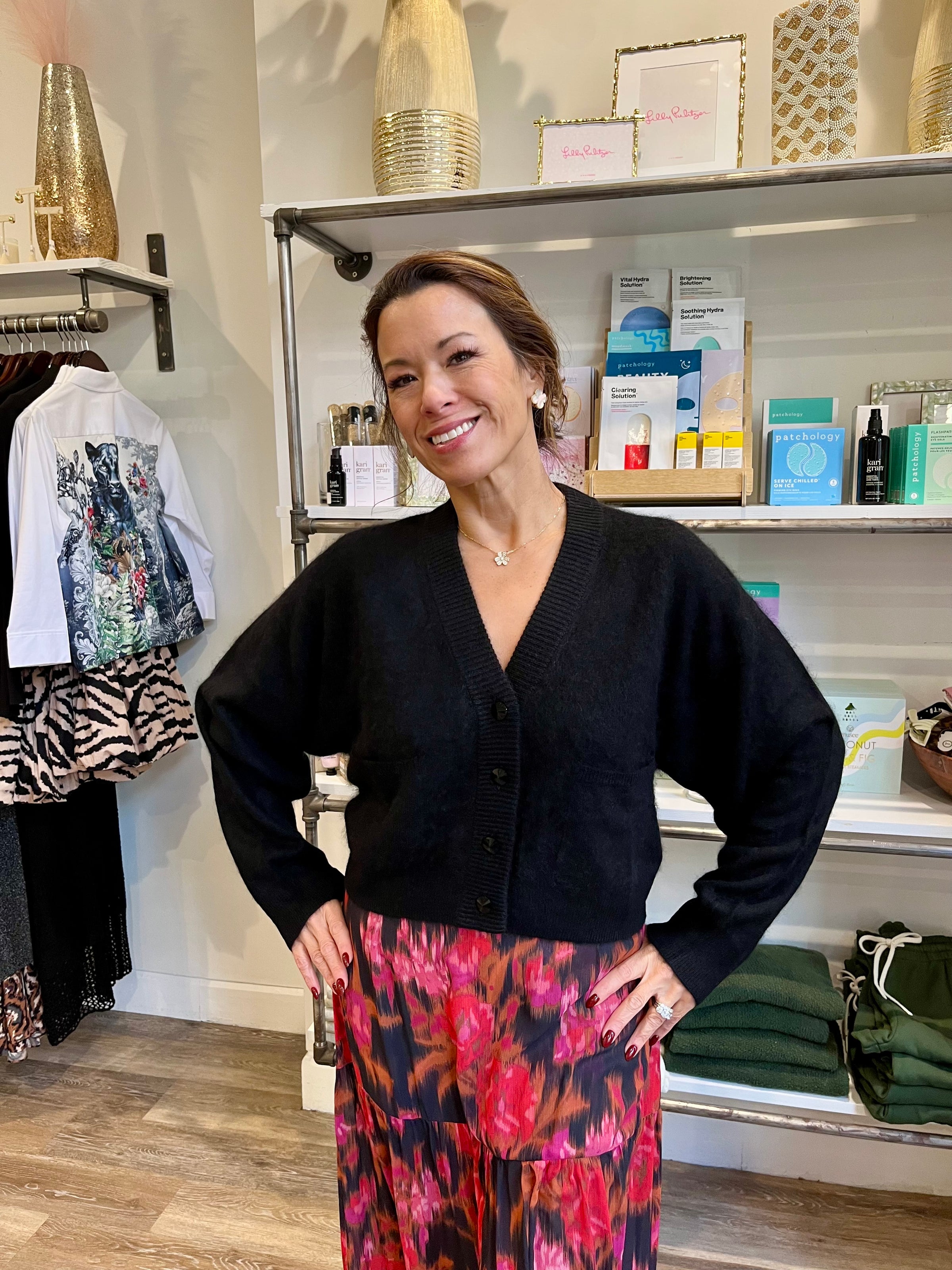 The perfect black holiday-ready cardigan in brushed cashmere. Featuring shiny black buttons, a boxier fit and cute pockets.
