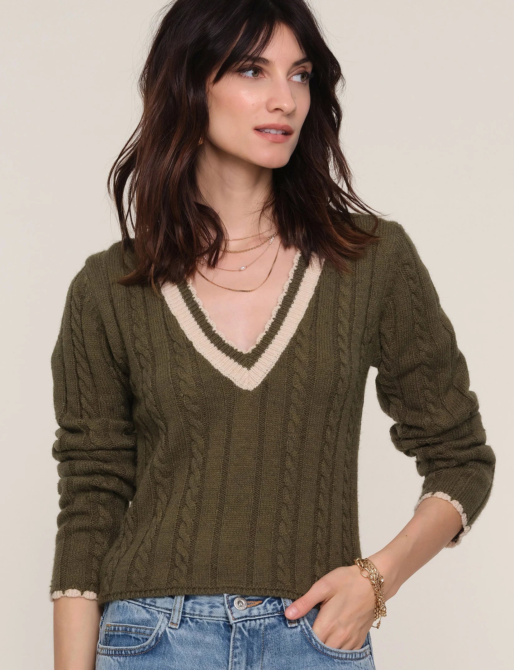 The Jaden Sweater is made from a super soft, melange knit. It features a cable stitch throughout the body and has contrast tipping at the neck.
