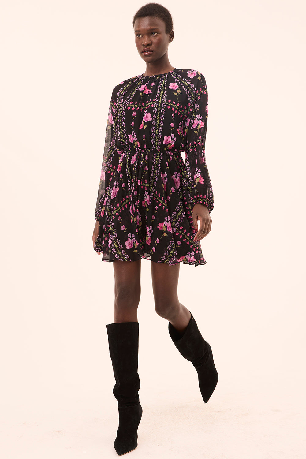 The Anthea Dress is a timeless mini, cut from a lovely Midnight Lattice printed chiffon. It features a high gathered neckline, long raglan blouson sleeves, and a keyhole button-back closure. An adjustable cinch-tie waist flatters the figure while flowing into a softly draped skirt. Fully double-lined for effortless wear, this style pairs perfectly with suede boots for a polished transitional look.