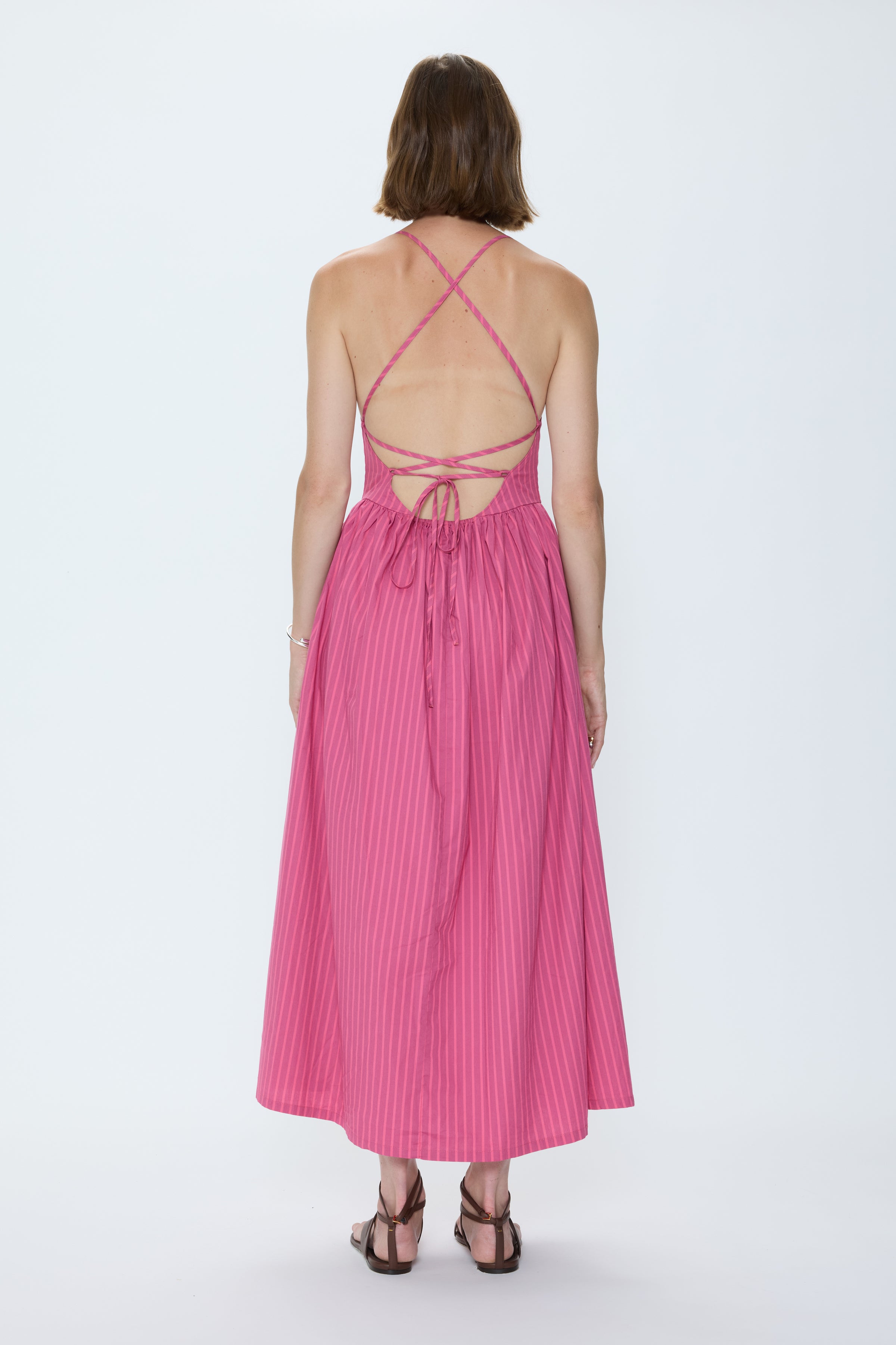 Sadee brings modern ease to warm-weather dressing with a fitted bodice, halter tie, and open back that adds effortless appeal to a seasonal staple. Vertical magenta stripes elongate the frame, while subtle seaming releases into a softly voluminous skirt for fluid movement. Designed to hit just above the ankles, it delivers a flattering, balanced proportion.