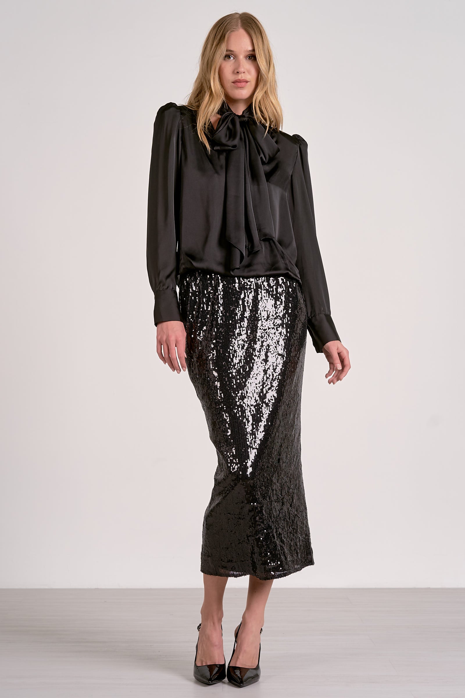 A silky illusion "wrap" top with a removable neck tie, a slight puff shoulder and cuffed sleeves. A slight bubble front and longer back for easier tucking.