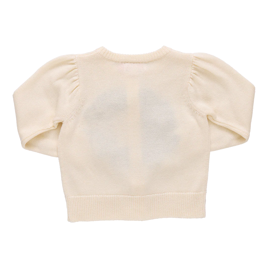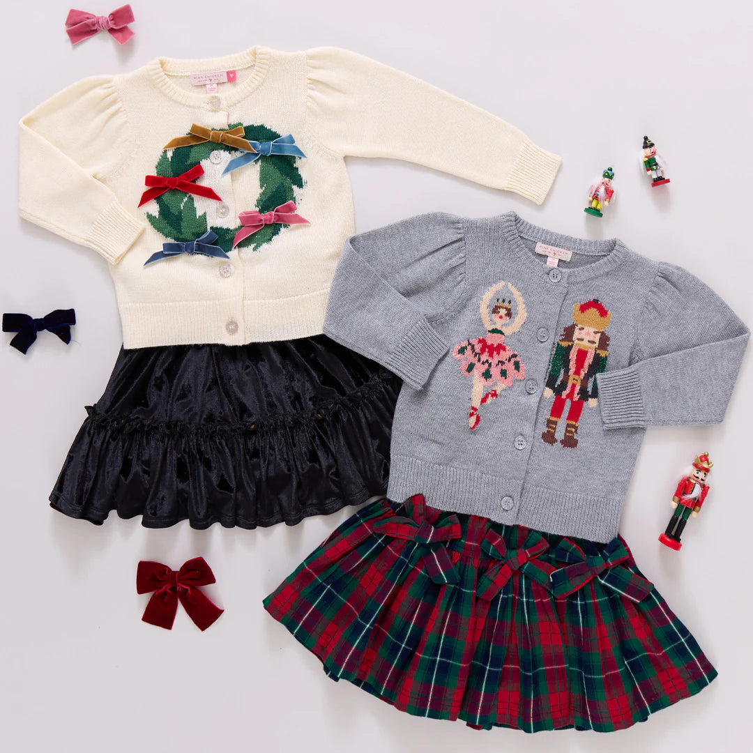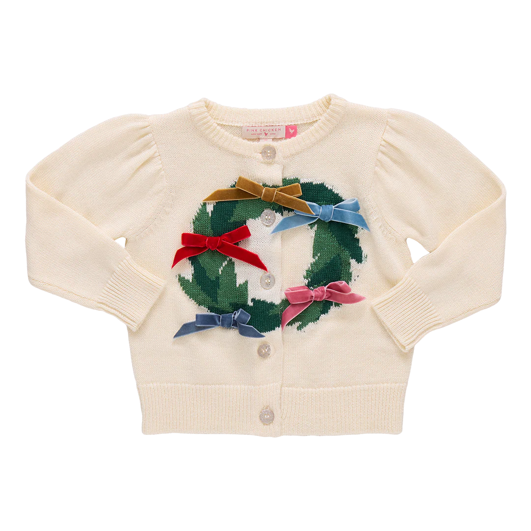 Hooray for the holidays! A lush beribboned evergreen wreath takes centerstage on our charming winter white Girls Constance Sweater. Colorful velvet bows and a sparkly green thread throughout bring this classic cardigan to life. A soft gathered puff shoulder, ribbed waist and cuffs and a cream glitter button closure elevate this well-loved shape.