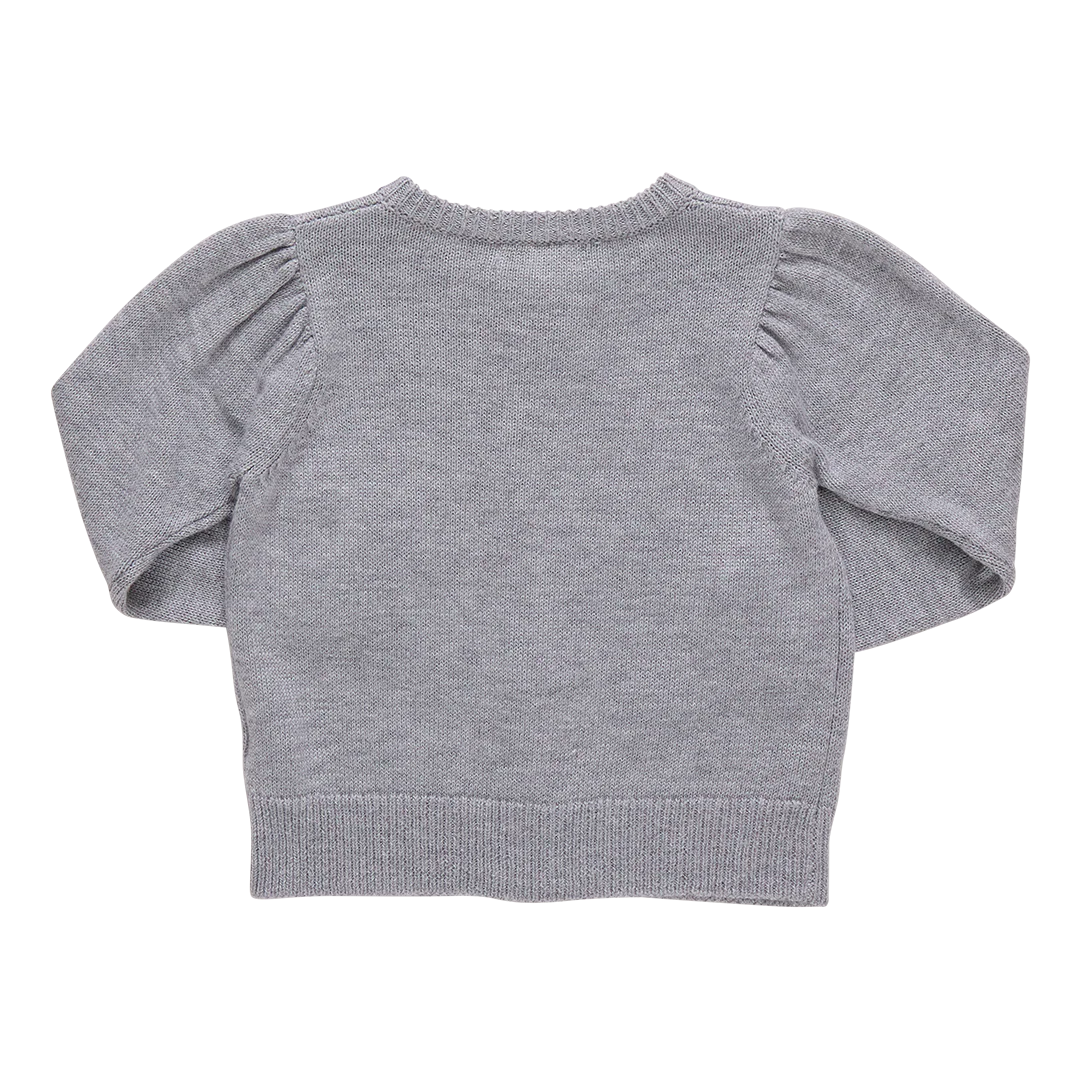 Hooray for the holidays! Holiday favorite The Nutcracker takes centerstage on our charming Girls Constance Sweater. Pink and green sparkle details on the Sugarplum Fairy and The Prince bring this classic cardigan to life. A soft gathered puff shoulder, ribbed waist and cuffs and a silver glitter button closure elevate this well-loved shape.