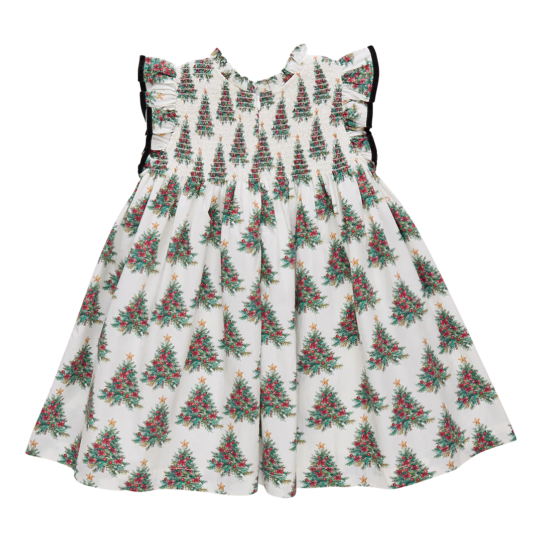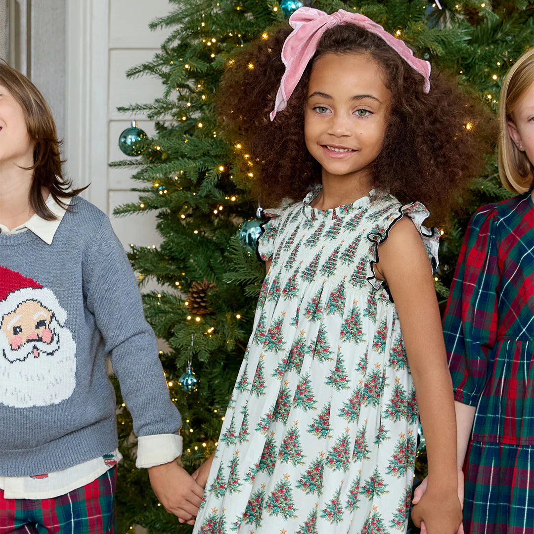 Winter Wonderland! A forest of dazzling evergreens lights up our elegant and vintage-inspired Girls Stevie Dress in Vintage Trees. Dressmaker details include a fluttery black velvet ruffled trimmed sleeve, subtle ruffle at the neck and a nostalgic smocking at the chest. Invisble zipper closure at the back. Top with our Holiday Wreath Girls Constance Sweater for a fashionable look fit for Christmas Dinner. Twin with baby sis in our Baby Girls Stevie Dress Set.