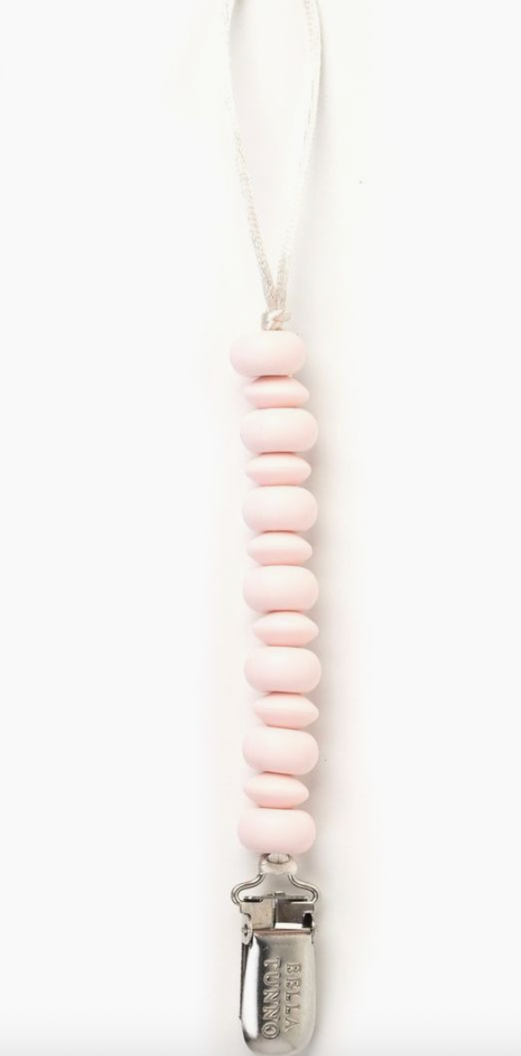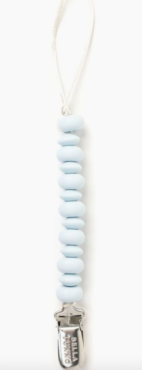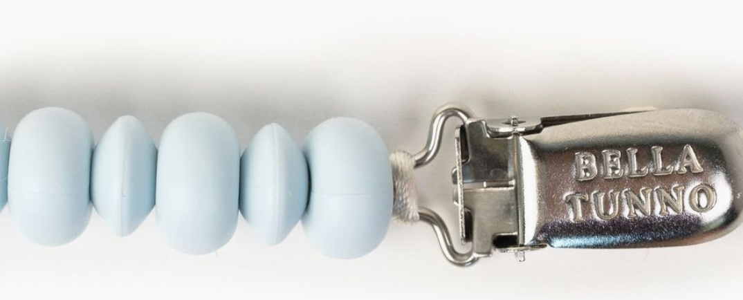 A modern, yet playful pacifier clip assortment. These paci clips are easy to mix and match with any outfit and the solid colors create a clean, modern look. New stainless steel clip makes the entire product dishwasher safe. Pacifier Clip designed to stay on clothes without leaving marks. Doubles as a teether and beading is soft on baby's gums. End bead knotted for safety and works with all pacifiers.